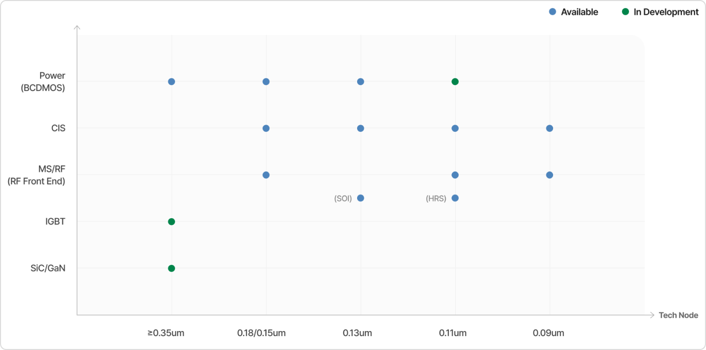 DB HiTek strategically fosters high-value-added specialty products based on Analog/Power (BCDMOS), CMOS Image Sensor, and Mixed Signal processes, while constantly advancing its technology development efforts. Recently, DB HiTek has also been aggressively expanding into new businesses based on next-generation materials such as SiC and GaN. With sales and technical support centers in key regions such as Korea, the United States, Europe, Taiwan, China, and Japan, DB HiTek listens closely to customers around the world, 24 hours a day.